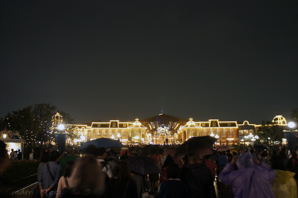 慌忙地隨便找個地方看晚間巡遊,不過!竟然不是原本的花車們!是下雨版的花車TTATT