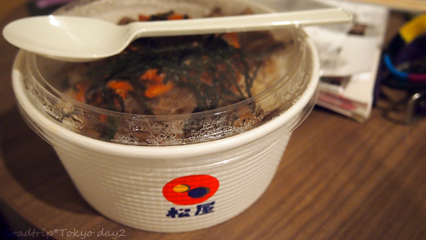 至於晚餐,本來打算直接在旅店附近的松屋吃的,不過累得像狗一樣就外帶回家,洗澡後才高高興興的吃晚飯!